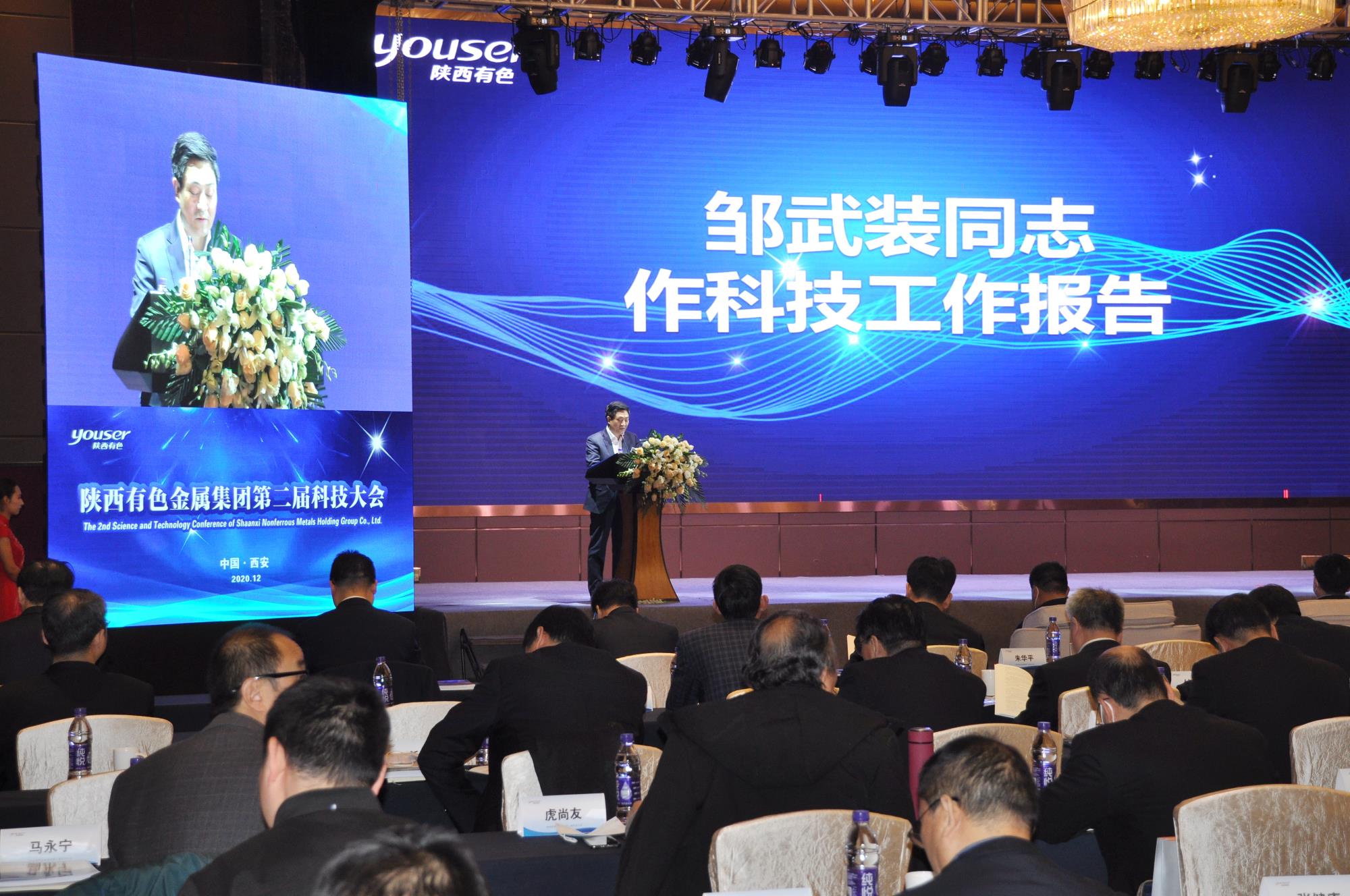 邹武装作了题为《加强创新驱动,夯实科技实力,为推动高质量高效益协同发展而努力奋斗》的科技工作报告。报告从四个方面对集团公司首届科技大会以来的科技创新工作进行了全面回顾总结。一是核心技术取得突破,形成发展新引擎,十年来集团公司共实施各类科技项目1000余项,开发的新产品、新工艺实现销售收入739亿元。二是平台建设取得较大进展,有效增强科研实力,目前集团公司拥有各类科技创新平台与基地39个,其中国家级平台10个。三是科研投入持续加大,创新成效不断显现,集团公司十年来科技投入累计超过134.9亿元,其中研发经费投入80.4亿元。获得省部级及以上科学技术奖187项,其中“高性能钼合金材料制备关键技术及其应用”项目获2013年国家技术发明二等奖;“基于页岩钒行业全过程污染防治的短流程清洁生产关键技术”项目获2017年国家技术发明二等奖;“深部资源电磁探测理论技术突破与应用”项目获2019年国家科技进步二等奖。“一种真空蠕变校形炉”专利获2016年中国专利金奖。共获得授权专利840件,主持或参与制定各类标准333项,其中国家军用标准36项,国家标准186项,行业标准99项。四是人才培养取得进展,技术队伍不断壮大,目前集团公司直接从事科研工作的人员有2959名,拥有三秦学者科技创新团队2个,国家及地方科技领军人才5名,享受国务院特殊津贴专家16名。